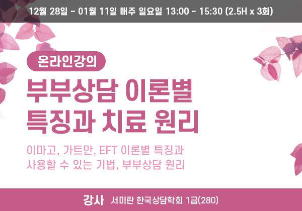 보다 전문적인 부부상담을 위해 뭔가 하나의 이론으로 깊이 있게 제대로 공부할 필요성을 느끼던 차에 신청하게 되었습니다. 다양한 이론과 자격증 과정들(그것도 고가의ㅠㅠ) 접근법이 너무 많으니까 뭘 선택해야 할지 잘 모르겠더라고요. 마침 공통점과 차이점을 비교해 주고 실제 개입 기법을 알려주는 강의가 있다고 해서 신청하게 되었는데, 이론적으로만 짚어 주시는 게 아니라 강사님이 실제로 그 훈련들을 다 경험해 보셨더라고요, 그래서 그 훈련과정에서 경험담을 들려주시는 것도 흥미로왔고, 앞으로 제가 하나의 이론을 잘 선택하는 데 도움이 많이 될 것 같습니다. 앞으로의 강의도 기대됩니다!