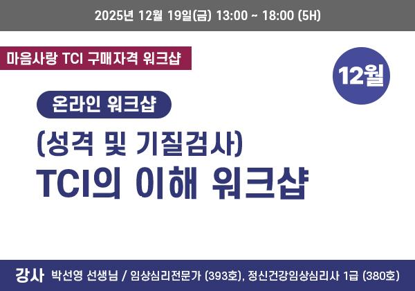 – 마음사랑 TCI 구매자격 워크숍 – 일 시 : 2025년 1월 17일(금) 13시~18시(총5시간) 신청기한 : 선착순 신청 마감 금 액 : 8만원(교재 포함), 온라인 검사 실시 포함 시 - 9만원 교 재 : 강의 1일전 홈페이지 업로드(마이페이지 > 서비스 예약목록에서 다운로드 가능하며, 업로드 후 환불 불가합니다.)