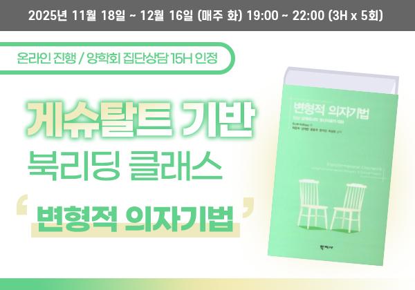 "변형적 의자기법" 일 시 : 11월 18일 ~ 12월 16일(매주 화) 시 간 : 19:00~22:00 (3Hx5회, 총 15H) 장 소 : 온라인(ZOOM) 진행 금 액 : 20만원 인 원 : 최소 6명 ~ 최대 15명