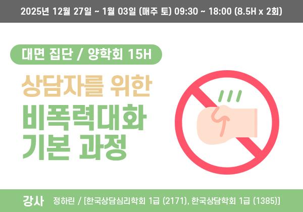 일 시 : 12월 27일(토), 01월 03일(토) 시 간 : 09:30~18:00 (7.5H x 2회, 총 15H) 금 액 : 25만원 장 소 : 마포구 도화동 541 일신빌딩 9층 인 원 : 최소 8명 ~ 최대 16명【코리더 1명모집(비폭력대화 기본과정 이수자)】 ※ 코리더 슈퍼비전을 위해 집단상담 두 시간이 녹음 될 수 있으며, 사전에 녹음 동의서를 요청드립니다.